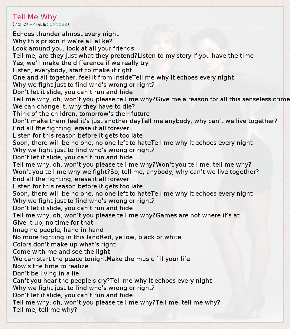 Echoes thunder almost every night Why this prison if we're all alike? Look around you, look at all your friends Tell me, are they just what they pretend?Listen to my story if you have the time Yes, we'll make the difference if we really try Listen, everybody, start to make it right One and all together, feel it from insideTell me why it echoes every night Why we fight just to find who's wrong or right? Don't let it slide, you can't run and hide Tell me why, oh, won't you please tell me why?Give me a reason for all this senseless crime We can change it, why they have to die? Think of the children, tomorrow's their future Don't make them feel it's just another dayTell me anybody, why can't we live together? End all the fighting, erase it all forever Listen for this reason before it gets too late Soon, there will be no one, no one left to hateTell me why it echoes every night Why we fight just to find who's wrong or right? Don't let it slide, you can't run and hide Tell me why, oh, won't you please tell me why?Won't you tell me, tell me why? Won't you tell me why we fight?So, tell me, anybody, why can't we live together? End all the fighting, erase it all forever Listen for this reason before it gets too late Soon, there will be no one, no one left to hateTell me why it echoes every night Why we fight just to find who's wrong or right? Don't let it slide, you can't run and hide Tell me why, oh, won't you please tell me why?Games are not where it's at Give it up, no time for that Imagine people, hand in hand No more fighting in this landRed, yellow, black or white Colors don't make up what's right Come with me and see the light We can start the peace tonightMake the music fill your life Now's the time to realize Don't be living in a lie Can't you hear the people's cry?Tell me why it echoes every night Why we fight just to find who's wrong or right? Don't let it slide, you can't run and hide Tell me why, oh, won't you please tell me why?Tell me, tell me why? Tell me, tell me why?