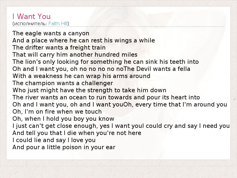 The eagle wants a canyon And a place where he can rest his wings a while The drifter wants a freight train That will carry him another hundred miles The lion's only looking for something he can sink his teeth into Oh and I want you, oh no no no no noThe Devil wants a fella With a weakness he can wrap his arms around The champion wants a challenger Who just might have the strength to take him down The river wants an ocean to run towards and pour its heart into Oh and I want you, oh and I want youOh, every time that I'm around you Oh, I'm on fire when we touch Oh, when I hold you boy you know I just can't get close enough, yes I want youI could cry and say I need you And tell you that I die when you're not here I could lie and say I love you And pour a little poison in your ear