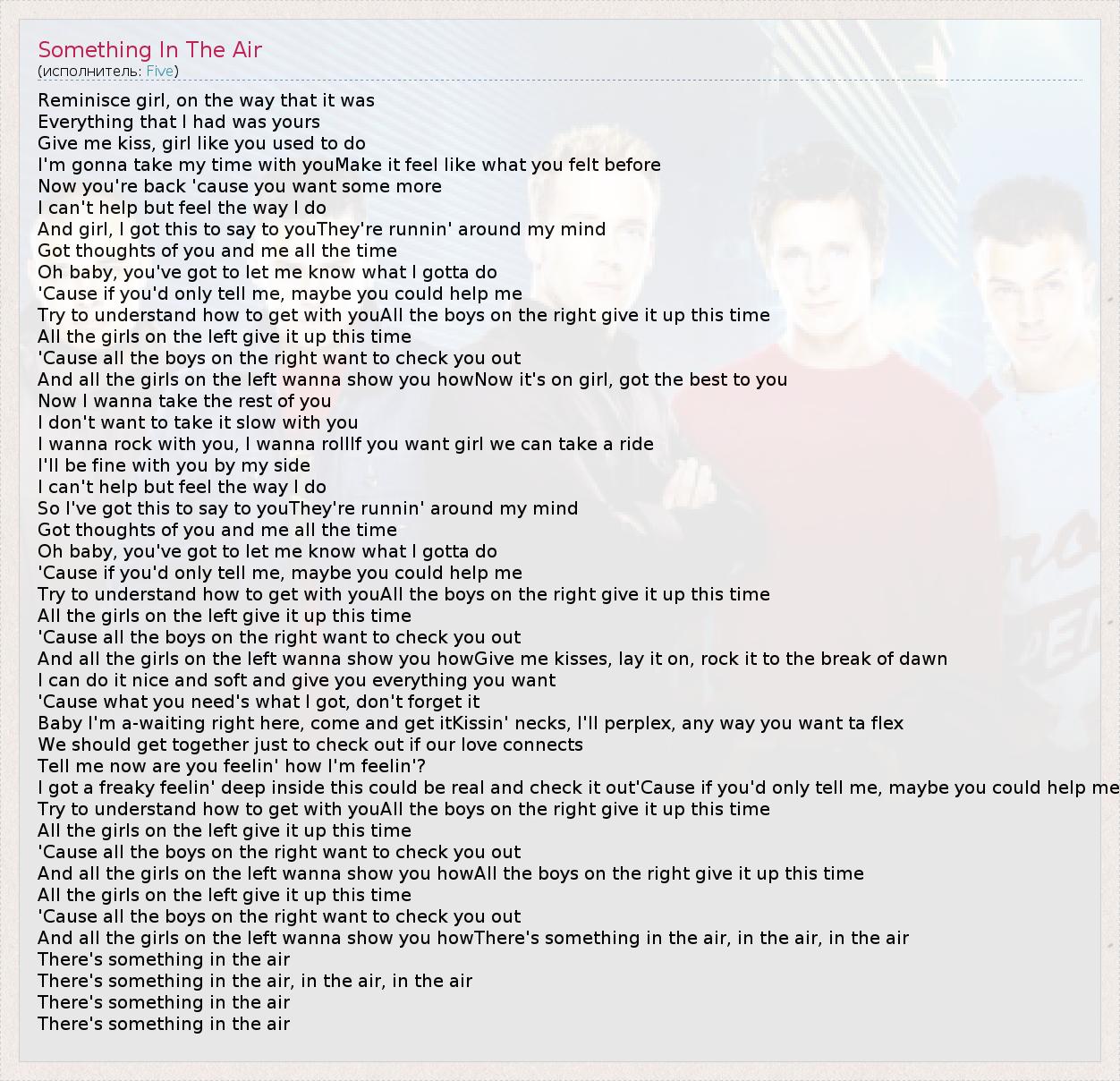 And all the girls on the left wanna show you howThere's something in the air, in the air, in the air