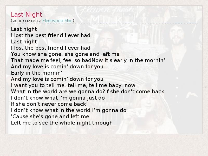 Это интересно:Fleetwood Mac (читается «Флитвуд Мэк») — влиятельная и коммерчески успешная британо-американская группа, которая с момента своего создания в июле 1967 года знала немало взлётов и падений, несколько раз обновляла состав и меняла стиль исполняемой музыки, благодаря чему смогла сохранить популярность дольше подавляющего большинства конкурентов — вплоть до самого конца XX века.1 Блюзовый и... продолжение