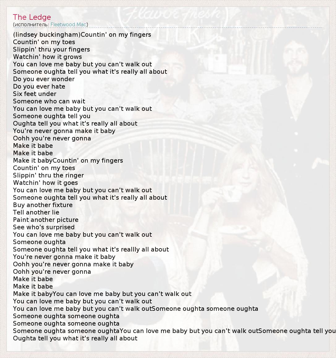 Это интересно:Fleetwood Mac (читается «Флитвуд Мэк») — влиятельная и коммерчески успешная британо-американская группа, которая с момента своего создания в июле 1967 года знала немало взлётов и падений, несколько раз обновляла состав и меняла стиль исполняемой музыки, благодаря чему смогла сохранить популярность дольше подавляющего большинства конкурентов — вплоть до самого конца XX века.1 Блюзовый и... продолжение