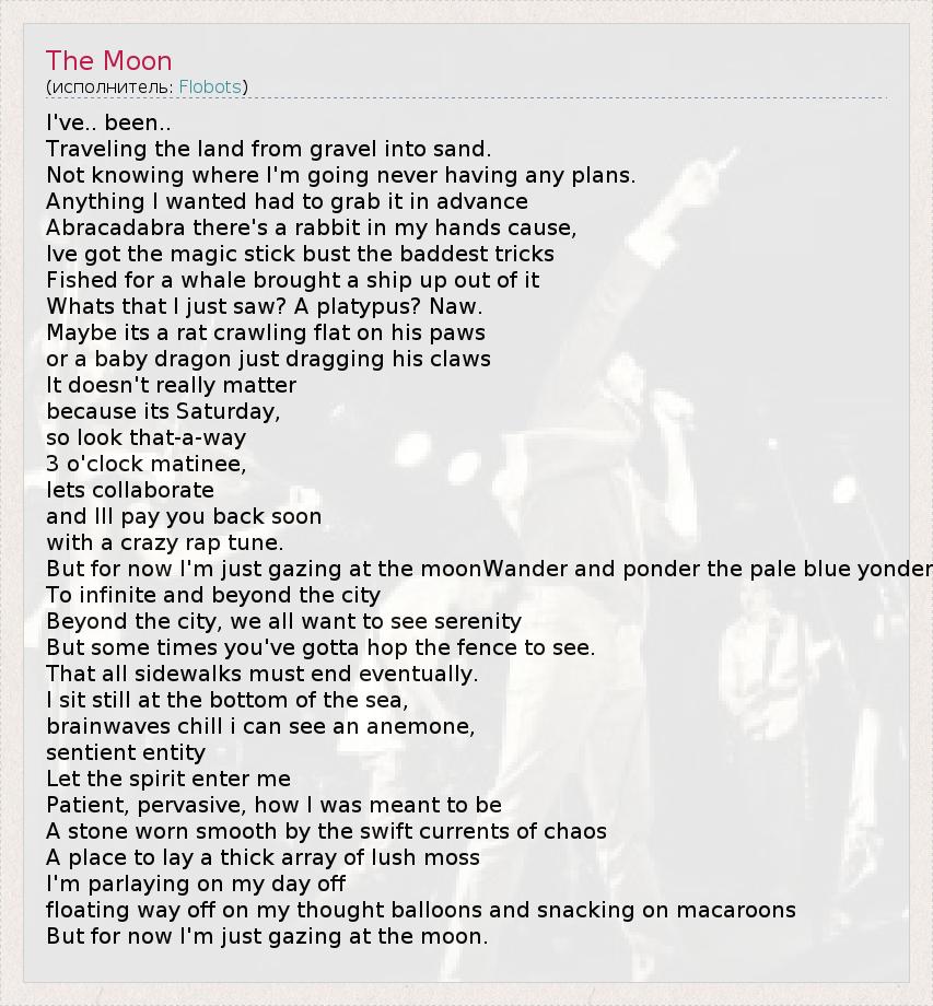 I've.. been.. Traveling the land from gravel into sand. Not knowing where I'm going never having any plans. Anything I wanted had to grab it in advance Abracadabra there's a rabbit in my hands cause, Ive got the magic stick bust the baddest tricks Fished for a whale brought a ship up out of it Whats that I just saw? A platypus? Naw. Maybe its a rat crawling flat on his paws or a baby dragon just dragging his claws It doesn't really matter because its Saturday, so look that-a-way 3 o'clock matinee, lets collaborate and Ill pay you back soon with a crazy rap tune. But for now I'm just gazing at the moonWander and ponder the pale blue yonder To infinite and beyond the city Beyond the city, we all want to see serenity But some times you've gotta hop the fence to see. That all sidewalks must end eventually. I sit still at the bottom of the sea, brainwaves chill i can see an anemone, sentient entity Let the spirit enter me Patient, pervasive, how I was meant to be A stone worn smooth by the swift currents of chaos A place to lay a thick array of lush moss I'm parlaying on my day off floating way off on my thought balloons and snacking on macaroons But for now I'm just gazing at the moon.