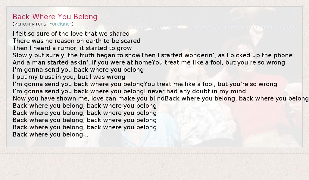А как ты думаешь, о чем песня "Back Where You Belong" ?
