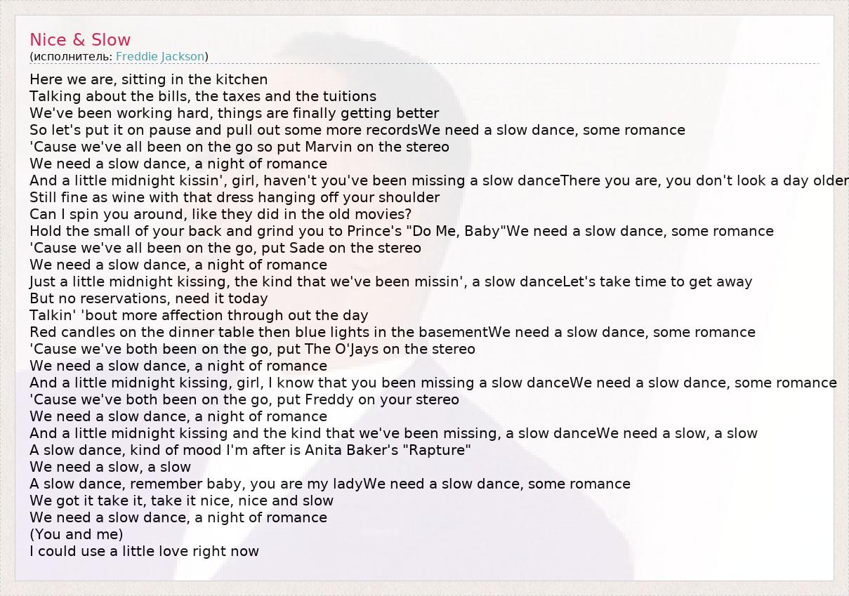 Here we are, sitting in the kitchen Talking about the bills, the taxes and the tuitions We've been working hard, things are finally getting better So let's put it on pause and pull out some more recordsWe need a slow dance, some romance 'Cause we've all been on the go so put Marvin on the stereo We need a slow dance, a night of romance And a little midnight kissin', girl, haven't you've been missing a slow danceThere you are, you don't look a day older Still fine as wine with that dress hanging off your shoulder Can I spin you around, like they did in the old movies? Hold the small of your back and grind you to Prince's "Do Me, Baby"We need a slow dance, some romance 'Cause we've all been on the go, put Sade on the stereo We need a slow dance, a night of romance Just a little midnight kissing, the kind that we've been missin', a slow danceLet's take time to get away But no reservations, need it today Talkin' 'bout more affection through out the day Red candles on the dinner table then blue lights in the basementWe need a slow dance, some romance 'Cause we've both been on the go, put The O'Jays on the stereo We need a slow dance, a night of romance And a little midnight kissing, girl, I know that you been missing a slow danceWe need a slow dance, some romance 'Cause we've both been on the go, put Freddy on your stereo We need a slow dance, a night of romance And a little midnight kissing and the kind that we've been missing, a slow danceWe need a slow, a slow A slow dance, kind of mood I'm after is Anita Baker's "Rapture" We need a slow, a slow A slow dance, remember baby, you are my ladyWe need a slow dance, some romance We got it take it, take it nice, nice and slow We need a slow dance, a night of romance (You and me) I could use a little love right now