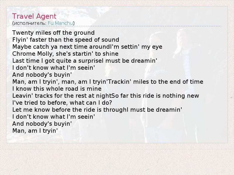 А как ты думаешь, о чем песня "Travel Agent" ?