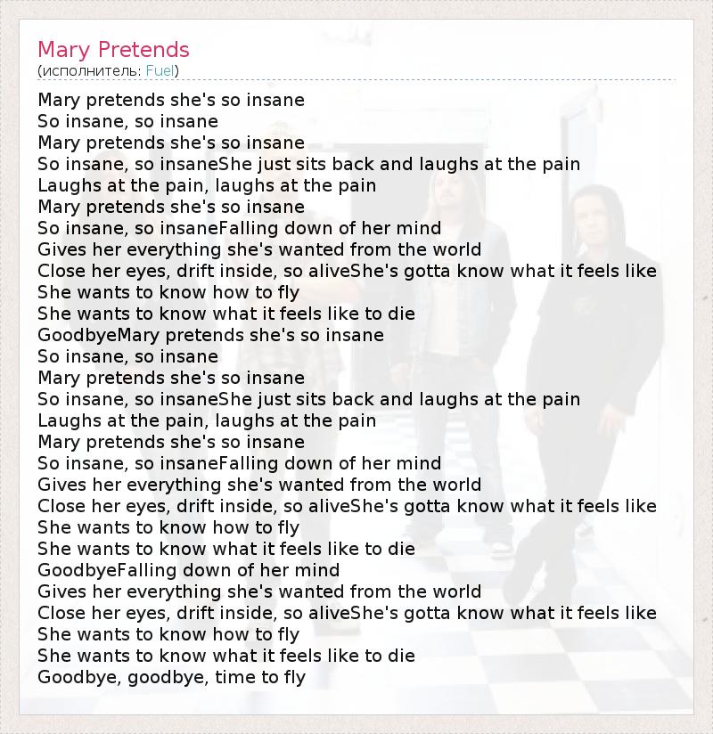 Mary pretends she's so insane So insane, so insane Mary pretends she's so insane So insane, so insaneShe just sits back and laughs at the pain Laughs at the pain, laughs at the pain Mary pretends she's so insane So insane, so insaneFalling down of her mind Gives her everything she's wanted from the world Close her eyes, drift inside, so aliveShe's gotta know what it feels like She wants to know how to fly She wants to know what it feels like to die GoodbyeMary pretends she's so insane So insane, so insane Mary pretends she's so insane So insane, so insaneShe just sits back and laughs at the pain Laughs at the pain, laughs at the pain Mary pretends she's so insane So insane, so insaneFalling down of her mind Gives her everything she's wanted from the world Close her eyes, drift inside, so aliveShe's gotta know what it feels like She wants to know how to fly She wants to know what it feels like to die GoodbyeFalling down of her mind Gives her everything she's wanted from the world Close her eyes, drift inside, so aliveShe's gotta know what it feels like She wants to know how to fly She wants to know what it feels like to die Goodbye, goodbye, time to fly