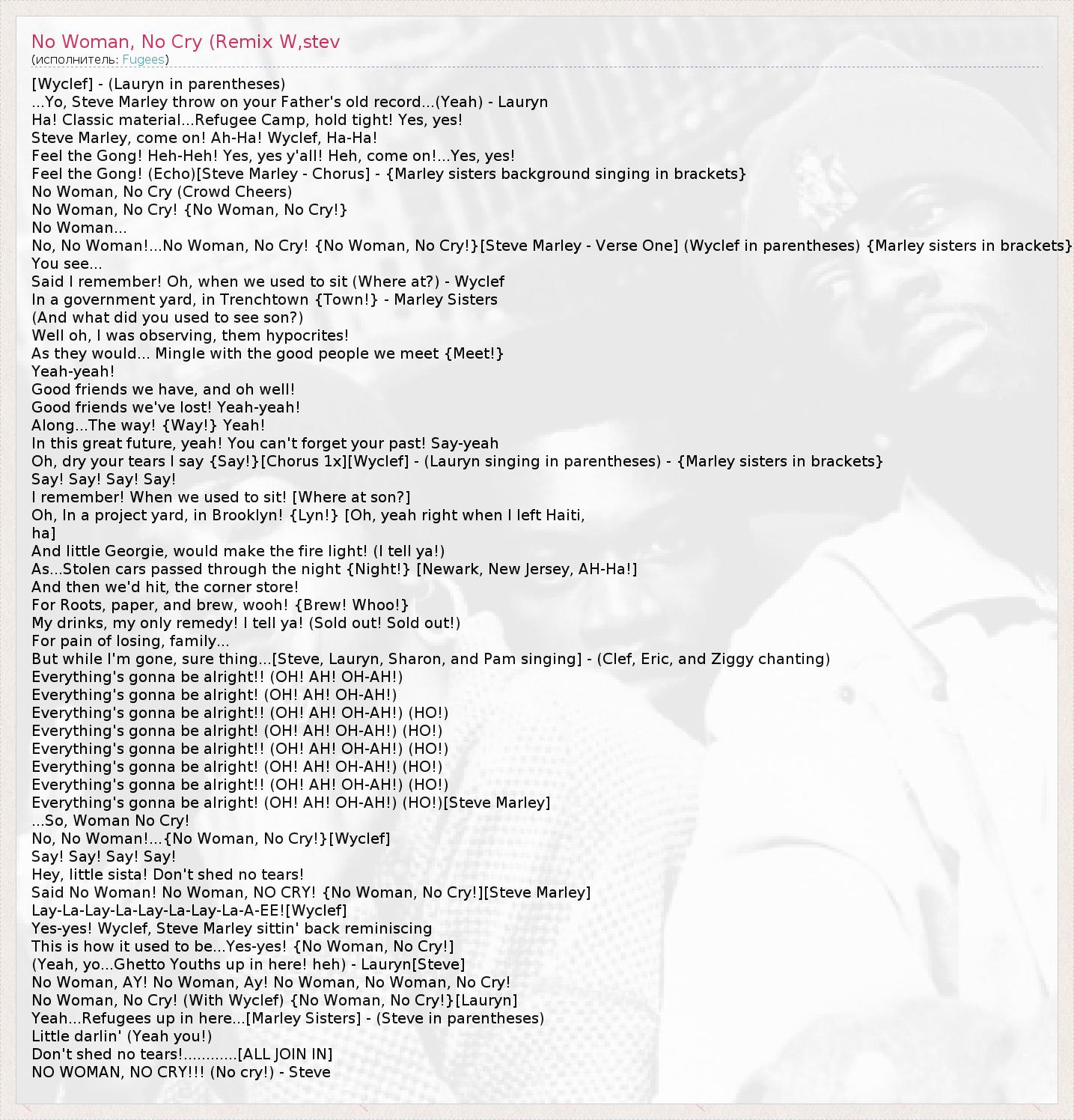 ГлавнаяИсполнителиFugeesNo Woman, No Cry (Remix W,stev