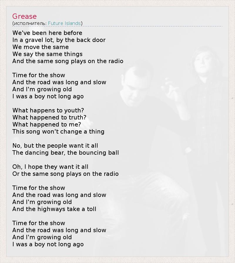 We've been here before In a gravel lot, by the back door We move the same We say the same things And the same song plays on the radio Time for the show And the road was long and slow And I'm growing old I was a boy not long ago What happens to youth? What happened to truth? What happened to me? This song won't change a thing No, but the people want it all The dancing bear, the bouncing ball Oh, I hope they want it all Or the same song plays on the radio Time for the show And the road was long and slow And I'm growing old And the highways take a toll Time for the show And the road was long and slow And I'm growing old I was a boy not long ago