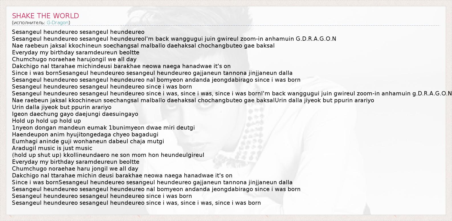 Sesangeul heundeureo sesangeul heundeureo since i was, since i was, since i was bornI'm back wanggugui juin gwireul zoom-in anhamuin g.D.R.A.G.O.N