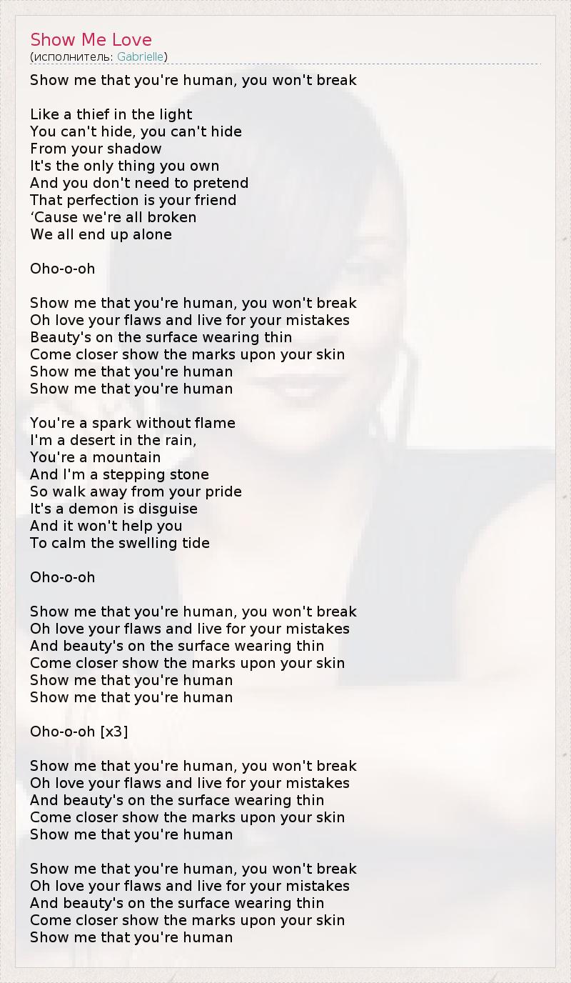 Show me that you're human, you won't break Like a thief in the light You can't hide, you can't hide From your shadow It's the only thing you own And you don't need to pretend That perfection is your friend ‘Cause we're all broken We all end up alone Oho-o-oh Show me that you're human, you won't break Oh love your flaws and live for your mistakes Beauty's on the surface wearing thin Come closer show the marks upon your skin Show me that you're human Show me that you're human You're a spark without flame I'm a desert in the rain, You're a mountain And I'm a stepping stone So walk away from your pride It's a demon is disguise And it won't help you To calm the swelling tide Oho-o-oh Show me that you're human, you won't break Oh love your flaws and live for your mistakes And beauty's on the surface wearing thin Come closer show the marks upon your skin Show me that you're human Show me that you're human Oho-o-oh [х3] Show me that you're human, you won't break Oh love your flaws and live for your mistakes And beauty's on the surface wearing thin Come closer show the marks upon your skin Show me that you're human Show me that you're human, you won't break Oh love your flaws and live for your mistakes And beauty's on the surface wearing thin Come closer show the marks upon your skin Show me that you're human
