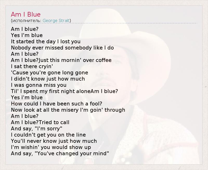 Am I blue? Yes I'm blue It started the day I lost you Nobody ever missed somebody like I do Am I blue? Am I blue?Just this mornin' over coffee I sat there cryin' 'Cause you're gone long gone I didn't know just how much I was gonna miss you Til' I spent my first night aloneAm I blue? Yes I'm blue How could I have been such a fool? Now look at all the misery I'm goin' through Am I blue? Am I blue?Tried to call And say, "I'm sorry" I couldn't get you on the line You'll never know just how much I'm wishin' you would show up And say, "You've changed your mind"