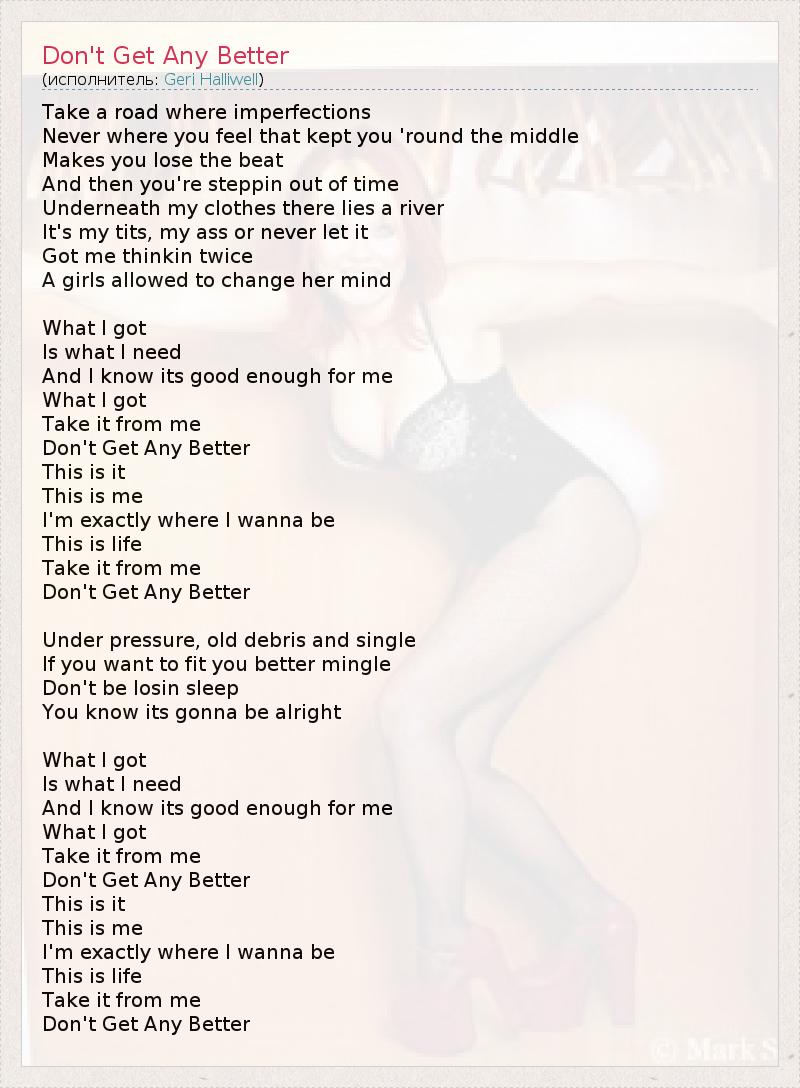 Take a road where imperfections Never where you feel that kept you 'round the middle Makes you lose the beat And then you're steppin out of time Underneath my clothes there lies a river It's my tits, my ass or never let it Got me thinkin twice A girls allowed to change her mind What I got Is what I need And I know its good enough for me What I got Take it from me Don't Get Any Better This is it This is me I'm exactly where I wanna be This is life Take it from me Don't Get Any Better Under pressure, old debris and single If you want to fit you better mingle Don't be losin sleep You know its gonna be alright What I got Is what I need And I know its good enough for me What I got Take it from me Don't Get Any Better This is it This is me I'm exactly where I wanna be This is life Take it from me Don't Get Any Better