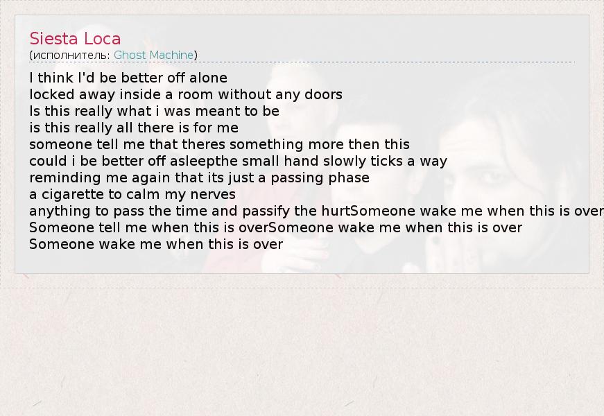 I think I'd be better off alone locked away inside a room without any doors Is this really what i was meant to be is this really all there is for me someone tell me that theres something more then this could i be better off asleepthe small hand slowly ticks a way reminding me again that its just a passing phase a cigarette to calm my nerves anything to pass the time and passify the hurtSomeone wake me when this is over Someone tell me when this is overSomeone wake me when this is over Someone wake me when this is over
