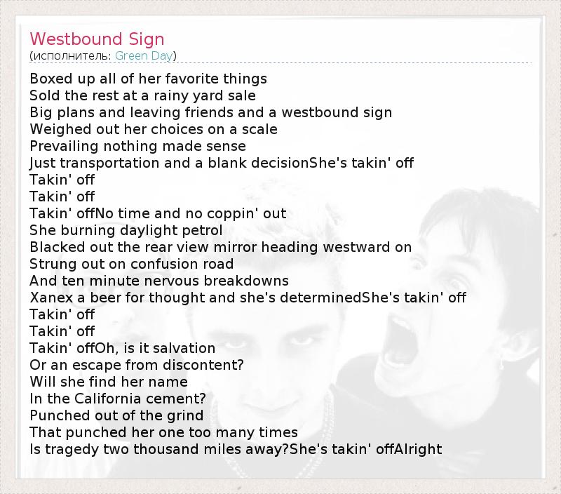 А как ты думаешь, о чем песня "Westbound Sign" ?