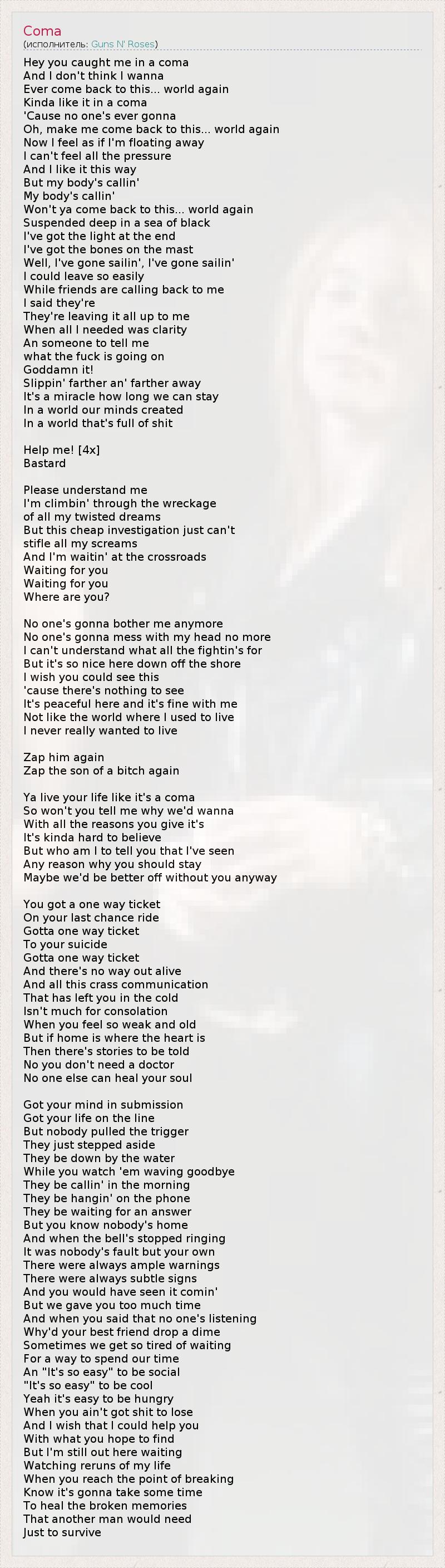 Это интересно:Guns N' Roses («Ганз н Роузес») — американская рок-группа из Лос-Анджелеса (штат Калифорния), получившая широкую известность в конце 1980-х и начале 1990-х.Группа завоевала всемирную популярность после выпуска компанией Geffen Records в 1987 году её первого долгоиграющего альбома Appetite for Destruction («Склонность к разрушению»). Успех был закреплён мировым турне и двумя... продолжение