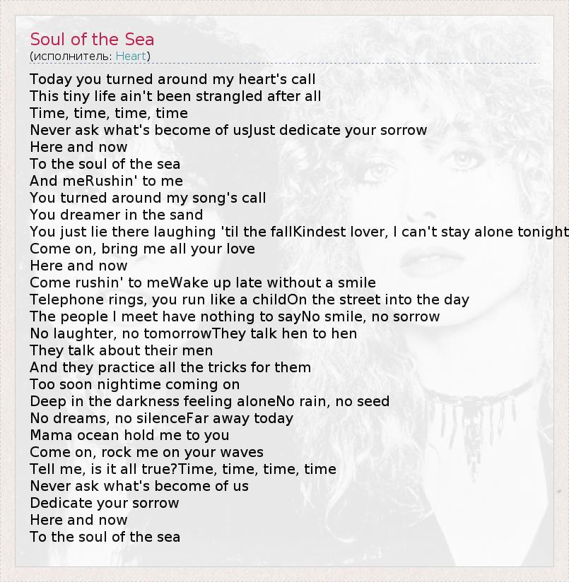 Today you turned around my heart's call This tiny life ain't been strangled after all Time, time, time, time Never ask what's become of usJust dedicate your sorrow Here and now To the soul of the sea And meRushin' to me You turned around my song's call You dreamer in the sand You just lie there laughing 'til the fallKindest lover, I can't stay alone tonight Come on, bring me all your love Here and now Come rushin' to meWake up late without a smile Telephone rings, you run like a childOn the street into the day The people I meet have nothing to sayNo smile, no sorrow No laughter, no tomorrowThey talk hen to hen They talk about their men And they practice all the tricks for them Too soon nightime coming on Deep in the darkness feeling aloneNo rain, no seed No dreams, no silenceFar away today Mama ocean hold me to you Come on, rock me on your waves Tell me, is it all true?Time, time, time, time Never ask what's become of us Dedicate your sorrow Here and now To the soul of the sea