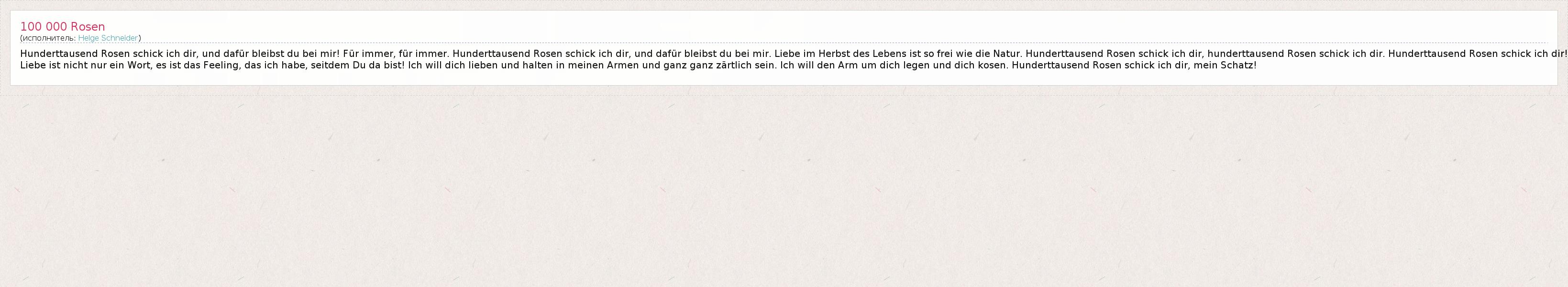 Hunderttausend Rosen schick ich dir, und dafür bleibst du bei mir! Für immer, für immer. Hunderttausend Rosen schick ich dir, und dafür bleibst du bei mir. Liebe im Herbst des Lebens ist so frei wie die Natur. Hunderttausend Rosen schick ich dir, hunderttausend Rosen schick ich dir. Hunderttausend Rosen schick ich dir! Liebe ist nicht nur ein Wort, es ist das Feeling, das ich habe, seitdem Du da bist! Ich will dich lieben und halten in meinen Armen und ganz ganz zärtlich sein. Ich will den Arm um dich legen und dich kosen. Hunderttausend Rosen schick ich dir, mein Schatz!