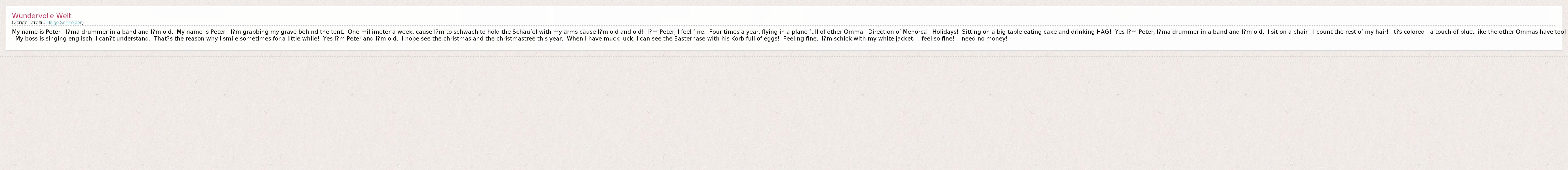 My boss is singing englisch, I can?t understand.  That?s the reason why I smile sometimes for a little while!  Yes I?m Peter and I?m old.  I hope see the christmas and the christmastree this year.  When I have muck luck, I can see the Easterhase with his Korb full of eggs!  Feeling fine.  I?m schick with my white jacket.  I feel so fine!  I need no money!