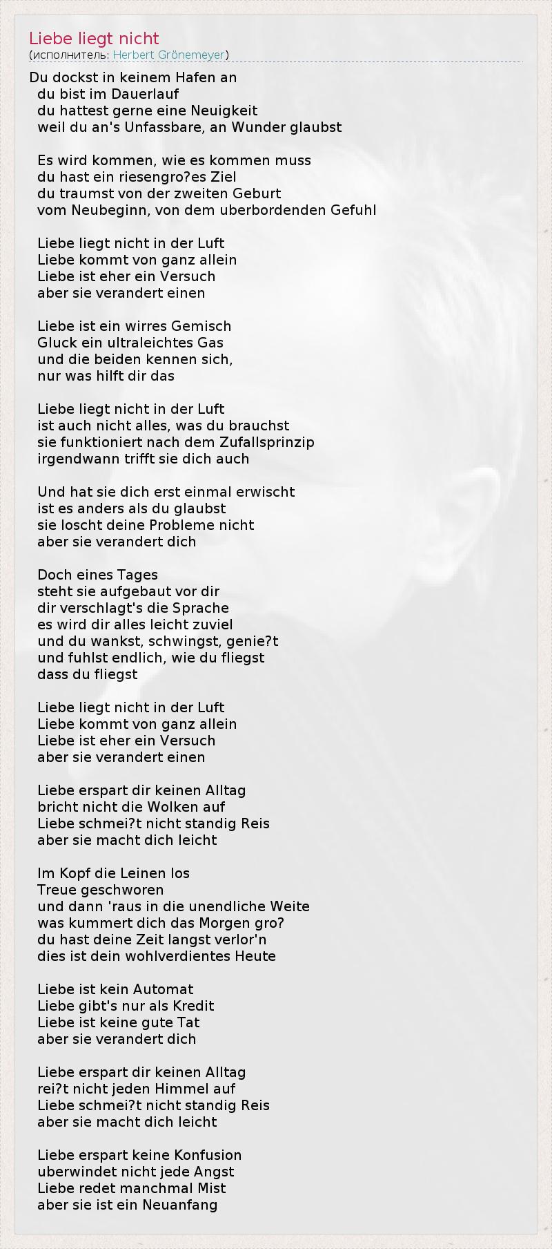 Du dockst in keinem Hafen an du bist im Dauerlauf du hattest gerne eine Neuigkeit weil du an's Unfassbare, an Wunder glaubst Es wird kommen, wie es kommen muss du hast ein riesengro?es Ziel du traumst von der zweiten Geburt vom Neubeginn, von dem uberbordenden Gefuhl Liebe liegt nicht in der Luft Liebe kommt von ganz allein Liebe ist eher ein Versuch aber sie verandert einen Liebe ist ein wirres Gemisch Gluck ein ultraleichtes Gas und die beiden kennen sich, nur was hilft dir das Liebe liegt nicht in der Luft ist auch nicht alles, was du brauchst sie funktioniert nach dem Zufallsprinzip irgendwann trifft sie dich auch Und hat sie dich erst einmal erwischt ist es anders als du glaubst sie loscht deine Probleme nicht aber sie verandert dich Doch eines Tages steht sie aufgebaut vor dir dir verschlagt's die Sprache es wird dir alles leicht zuviel und du wankst, schwingst, genie?t und fuhlst endlich, wie du fliegst dass du fliegst Liebe liegt nicht in der Luft Liebe kommt von ganz allein Liebe ist eher ein Versuch aber sie verandert einen Liebe erspart dir keinen Alltag bricht nicht die Wolken auf Liebe schmei?t nicht standig Reis aber sie macht dich leicht Im Kopf die Leinen los Treue geschworen und dann 'raus in die unendliche Weite was kummert dich das Morgen gro? du hast deine Zeit langst verlor'n dies ist dein wohlverdientes Heute Liebe ist kein Automat Liebe gibt's nur als Kredit Liebe ist keine gute Tat aber sie verandert dich Liebe erspart dir keinen Alltag rei?t nicht jeden Himmel auf Liebe schmei?t nicht standig Reis aber sie macht dich leicht Liebe erspart keine Konfusion uberwindet nicht jede Angst Liebe redet manchmal Mist aber sie ist ein Neuanfang