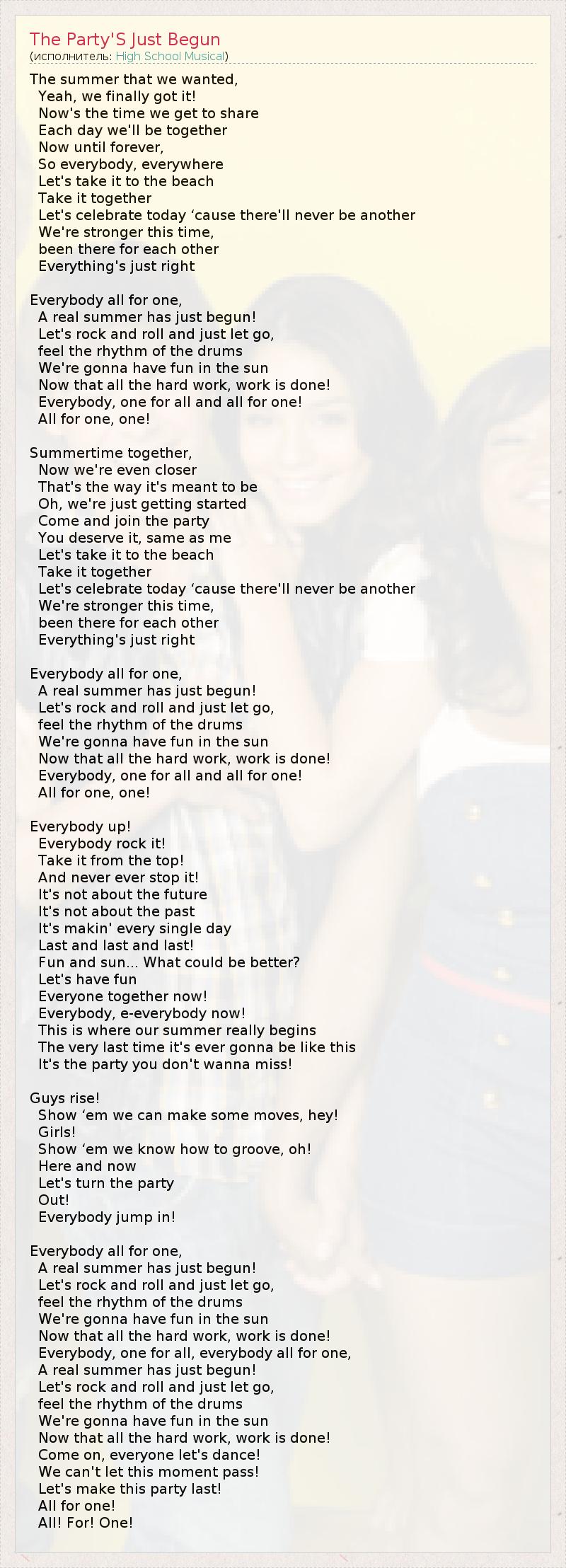 Лето, которое хотели, Наконец-то получили! Пришло время разделить; Каждый день мы будем вместе С этого дня и навсегда, Так что все, кто меня слышит - Бегом на пляж! Повеселимся вместе! Давайте отпразднуем сегодня, другой такой шанс не скоро выпадет. Теперь мы сильнее, Ведь мы есть друг у друга, Всё просто замечательно! Ну же, все за одного! Реально лето началось только сейчас. Давайте зажжём и оторвёмся! Почувствуем ритм барабанов, Понежимся на солнышке! Всю трудную работу мы уже сделали! Ну же, один за всех и все за одного! Все за одного, одного! Проводим лето вместе. Теперь мы даже ближе - Так и должно быть! Мы только начали, Присоединяйся к нашей вечеринке! Ты заслужил это так же, как и я. Бегом на пляж! Повеселимся вместе! Давайте отпразднуем сегодня, другой такой шанс не скоро выпадет. Теперь мы сильнее, Ведь мы есть друг у друга. Всё просто замечательно! Ну же, все за одного! Реально лето началось только сейчас. Давайте зажжём и оторвёмся Почувствуем ритм барабанов, Понежимся на солнышке! Всю трудную работу мы уже сделали! Ну же, один за всех и все за одного! Все за одного, одного! Ну-ка, все, подъём! Начинаем вечеринку! Отрывайтесь по полной, И ни за что не останавливайтесь! Дело не в прошедшем И не в будущем тоже, Дело в каждом дне, Который как последний! Понежиться на солнышке... Что может быть лучше? Давайте повеселимся сейчас, Когда мы все вместе! Ну-ка все, кто нас слышит: Вот где начинается наше лето! В последнее время всё было далеко не так, Это вечеринку ты не хотел бы пропустить! Эй, парни! Давайте покажем, как мы можем двигаться! Эй, девчонки! Давайте покажем, что мы не хуже! Здесь и сейчас Нашу вечеринку объявляем... Открытой! Люди, не стесняйтесь! Ну же, все за одного! Реально лето началось только сейчас. Давайте зажжём и оторвёмся Почувствуем ритм барабанов, Понежимся на солнышке! Всю трудную работу мы уже сделали! Ну же, один за всех. Все за одного! Реально лето началось только сейчас Давайте зажжём и оторвёмся Почувствуем ритм барабанов, Понежимся на солнышке! Всю трудную работу мы уже сделали! Давайте потанцуем! Нельзя пропустить такой момент! Пусть эта вечеринка длится! Все за одного! Все! За! Одного!
