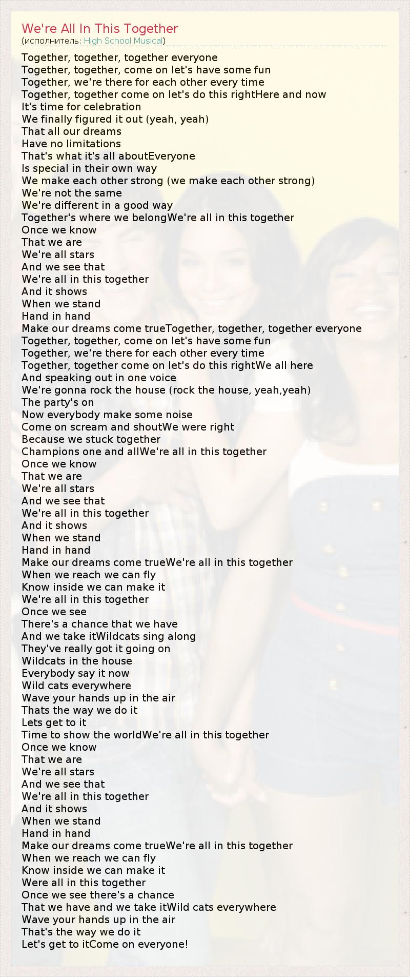 А как ты думаешь, о чем песня "We're All In This Together" ?