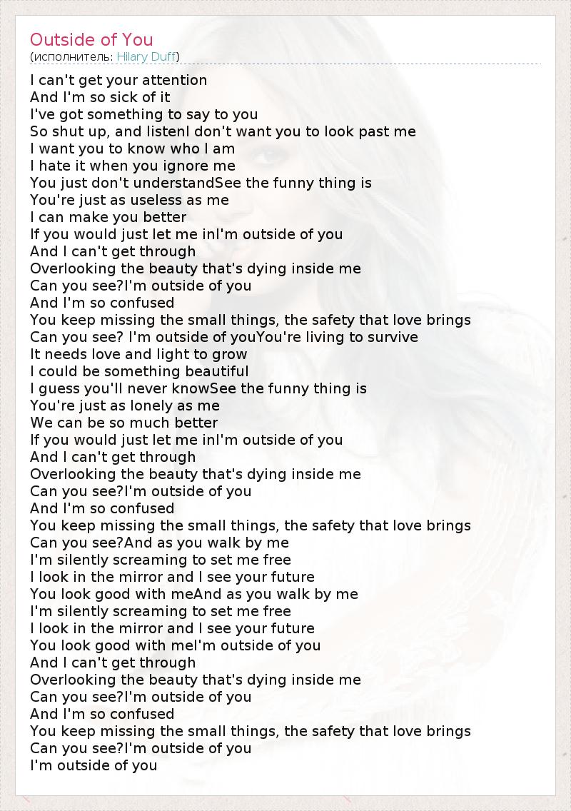 I can't get your attention And I'm so sick of it I've got something to say to you So shut up, and listenI don't want you to look past me I want you to know who I am I hate it when you ignore me You just don't understandSee the funny thing is You're just as useless as me I can make you better If you would just let me inI'm outside of you And I can't get through Overlooking the beauty that's dying inside me Can you see?I'm outside of you And I'm so confused You keep missing the small things, the safety that love brings Can you see? I'm outside of youYou're living to survive It needs love and light to grow I could be something beautiful I guess you'll never knowSee the funny thing is You're just as lonely as me We can be so much better If you would just let me inI'm outside of you And I can't get through Overlooking the beauty that's dying inside me Can you see?I'm outside of you And I'm so confused You keep missing the small things, the safety that love brings Can you see?And as you walk by me I'm silently screaming to set me free I look in the mirror and I see your future You look good with meAnd as you walk by me I'm silently screaming to set me free I look in the mirror and I see your future You look good with meI'm outside of you And I can't get through Overlooking the beauty that's dying inside me Can you see?I'm outside of you And I'm so confused You keep missing the small things, the safety that love brings Can you see?I'm outside of you I'm outside of you