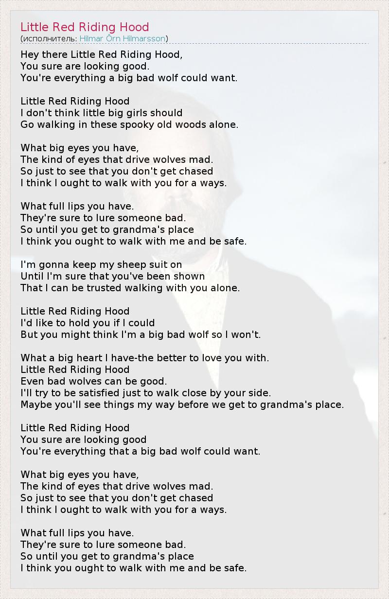 Привет, Красная Шапочка, Ты, конечно, хороша собой. Ты – все, о чем большой злой волк мог только мечтать. Красная Шапочка, Не думаю, что маленькие "большие" девочки должны Гулять в этом зловещем, старом лесу в одиночестве. Какие большие у тебя глаза, Такие глаза, которые сводят волков с ума. И только чтобы убедиться, что на тебя никто не охотится, Наверно, я должен идти с тобой по пути. Какие сочные у тебя губы. Наверняка, они соблазняют кого-то плохого. Так что, пока ты не доберешься до домика бабушки, Думаю, ты должна идти со мной и быть в безопасности. Я не буду пока снимать свой костюм овечки, Пока ты не покажешь, Что доверяешь мне настолько, чтобы я шел с тобой. Красная Шапочка, Я бы хотел обнять тебя, если бы мог, Но вдруг ты подумаешь, что я большой злой волк, так что я не буду. Какое большое у меня сердце – как раз, чтобы любить тебя. Красная шапочка, Даже плохие волки могут быть хорошими. Я постараюсь довольствоваться тем, чтобы просто идти рядом. Может, ты увидишь все моими глазами прежде, чем мы дойдем до домика бабушки. Красная Шапочка, Ты, конечно, хороша собой. Ты – все, о чем большой злой волк мог только мечтать. Какие большие у тебя глаза, Такие глаза, которые сводят волков с ума. И только чтобы убедиться, что на тебя никто не охотится, Наверно, я должен идти с тобой по пути. Какие сочные у тебя губы. Наверняка, они соблазняют кого-то плохого. Так что, пока ты не доберешься до домика бабушки, Думаю, ты должна идти со мной и быть в безопасности.