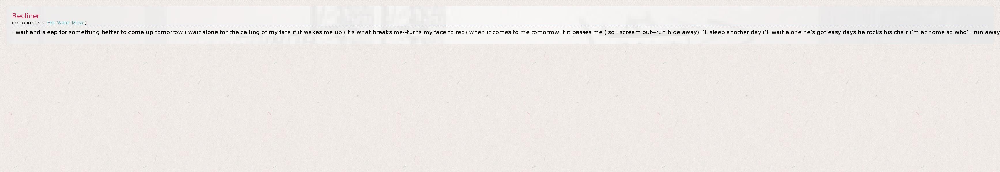 i wait and sleep for something better to come up tomorrow i wait alone for the calling of my fate if it wakes me up (it's what breaks me--turns my face to red) when it comes to me tomorrow if it passes me ( so i scream out--run hide away) i'll sleep another day i'll wait alone he's got easy days he rocks his chair i'm at home so who'll run away
