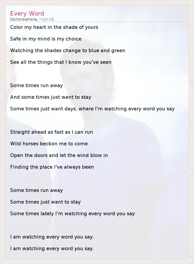 Color my heart in the shade of yours Safe in my mind is my choice Watching the shades change to blue and green See all the things that I know you've seen Some times run away And some times just want to stay Some times just want days, where I'm watching every word you say Straight ahead as fast as I can run Wild horses beckon me to come Open the doors and let the wind blow in Finding the place I've always been Some times run away Some times just want to stay Some times lately I'm watching every word you say I am watching every word you say. I am watching every word you say.