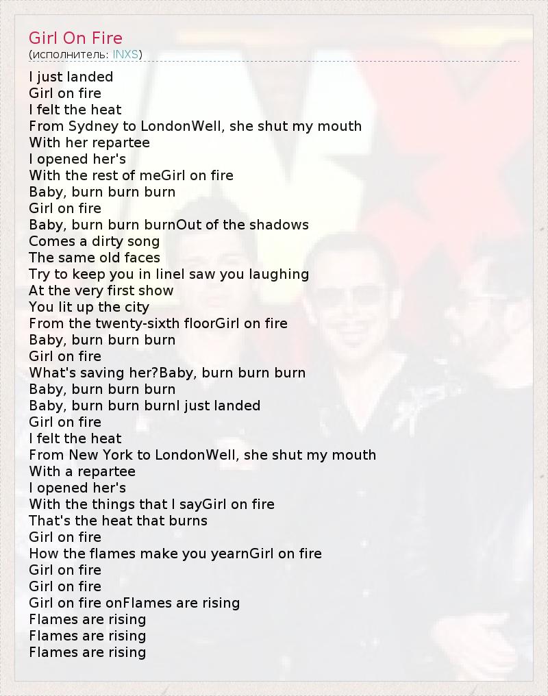 I just landed Girl on fire I felt the heat From Sydney to LondonWell, she shut my mouth With her repartee I opened her's With the rest of meGirl on fire Baby, burn burn burn Girl on fire Baby, burn burn burnOut of the shadows Comes a dirty song The same old faces Try to keep you in lineI saw you laughing At the very first show You lit up the city From the twenty-sixth floorGirl on fire Baby, burn burn burn Girl on fire What's saving her?Baby, burn burn burn Baby, burn burn burn Baby, burn burn burnI just landed Girl on fire I felt the heat From New York to LondonWell, she shut my mouth With a repartee I opened her's With the things that I sayGirl on fire That's the heat that burns Girl on fire How the flames make you yearnGirl on fire Girl on fire Girl on fire Girl on fire onFlames are rising Flames are rising Flames are rising Flames are rising