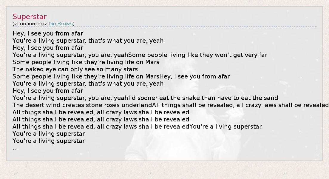 Это интересно:Ян Браун, Иэн Браун (Ian George Brown), - британский рок-музыкант, бывший лидер группы the stone roses (1984-1996). С 1996 года выступает сольно.Браун родился 20 февраля 1963 года в Уоррингтоне. Происходит из семьи рабочего класса (его отец был столяром, мать работала на бумажной фабрике). Браун вырос в Тимперли (Южный Манчестер). Интерес к музыке у него появился благодаря первым... продолжение
