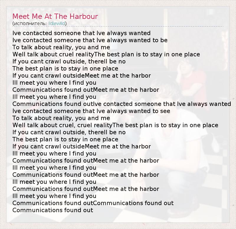 Ive contacted someone that Ive always wanted Ive contacted someone that Ive always wanted to be To talk about reality, you and me Well talk about cruel realityThe best plan is to stay in one place If you cant crawl outside, therell be no The best plan is to stay in one place If you cant crawl outsideMeet me at the harbor Ill meet you where I find you Communications found outMeet me at the harbor Ill meet you where I find you Communications found outIve contacted someone that Ive always wanted Ive contacted someone that Ive always wanted to see To talk about reality, you and me Well talk about cruel, cruel realityThe best plan is to stay in one place If you cant crawl outside, therell be no The best plan is to stay in one place If you cant crawl outsideMeet me at the harbor Ill meet you where I find you Communications found outMeet me at the harbor Ill meet you where I find you Communications found outMeet me at the harbor Ill meet you where I find you Communications found outMeet me at the harbor Ill meet you where I find you Communications found outCommunications found out Communications found out