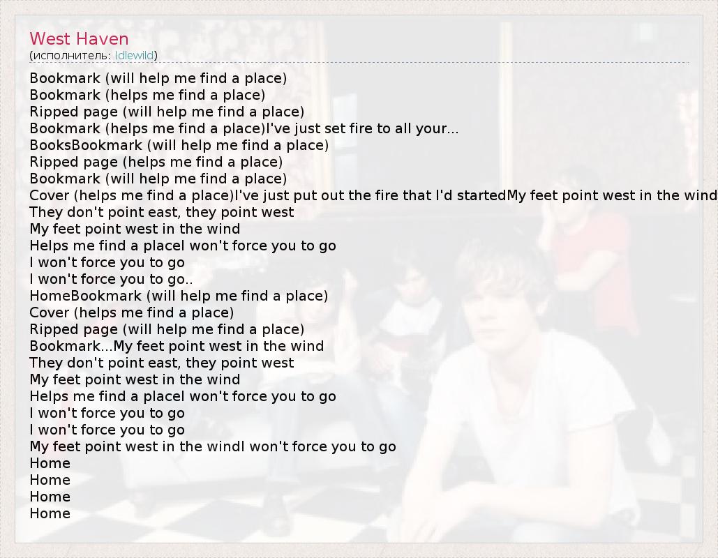 Cover (helps me find a place)I've just put out the fire that I'd startedMy feet point west in the wind