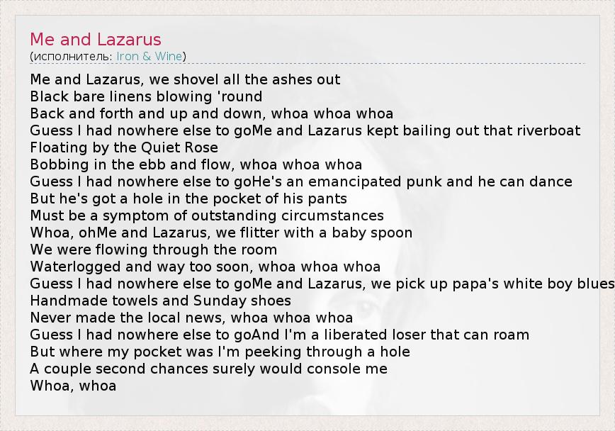 А как ты думаешь, о чем песня "Me and Lazarus" ?