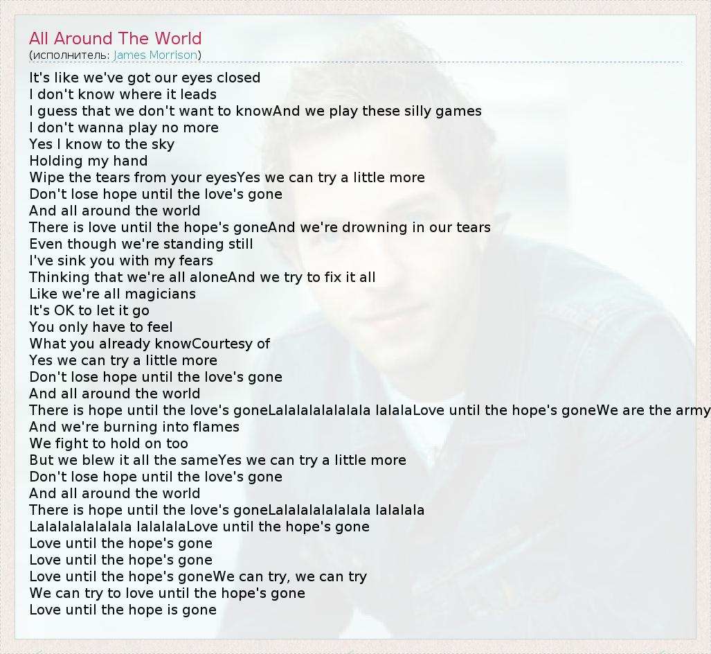 It's like we've got our eyes closed I don't know where it leads I guess that we don't want to knowAnd we play these silly games I don't wanna play no more Yes I know to the sky Holding my hand Wipe the tears from your eyesYes we can try a little more Don't lose hope until the love's gone And all around the world There is love until the hope's goneAnd we're drowning in our tears Even though we're standing still I've sink you with my fears Thinking that we're all aloneAnd we try to fix it all Like we're all magicians It's OK to let it go You only have to feel What you already knowCourtesy of Yes we can try a little more Don't lose hope until the love's gone And all around the world There is hope until the love's goneLalalalalalalala lalalaLove until the hope's goneWe are the army And we're burning into flames We fight to hold on too But we blew it all the sameYes we can try a little more Don't lose hope until the love's gone And all around the world There is hope until the love's goneLalalalalalalala lalalala Lalalalalalalala lalalalaLove until the hope's gone Love until the hope's gone Love until the hope's gone Love until the hope's goneWe can try, we can try We can try to love until the hope's gone Love until the hope is gone