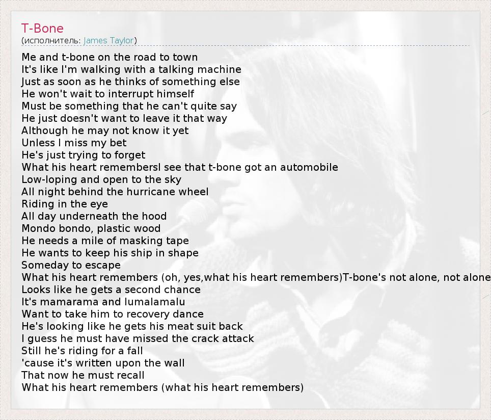 What his heart remembers (oh, yes,what his heart remembers)T-bone's not alone, not alone