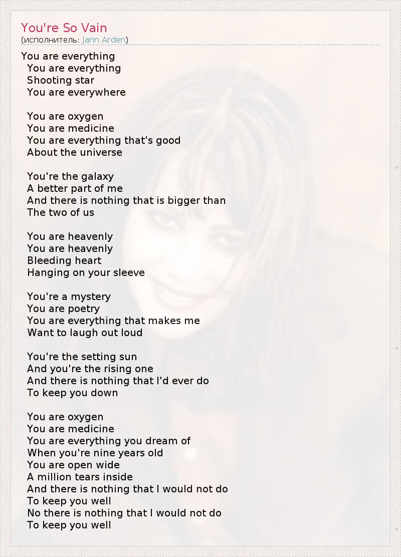 You are everything You are everything Shooting star You are everywhere You are oxygen You are medicine You are everything that's good About the universe You're the galaxy A better part of me And there is nothing that is bigger than The two of us You are heavenly You are heavenly Bleeding heart Hanging on your sleeve You're a mystery You are poetry You are everything that makes me Want to laugh out loud You're the setting sun And you're the rising one And there is nothing that I'd ever do To keep you down You are oxygen You are medicine You are everything you dream of When you're nine years old You are open wide A million tears inside And there is nothing that I would not do To keep you well No there is nothing that I would not do To keep you well