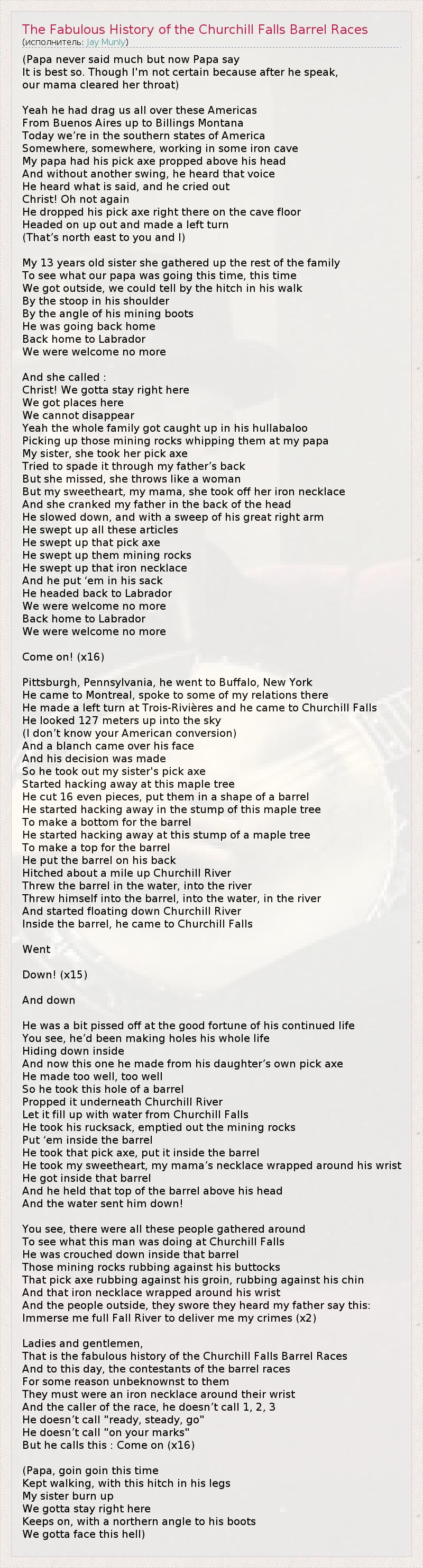 А как ты думаешь, о чем песня "The Fabulous History of the Churchill Falls Barrel Races" ?