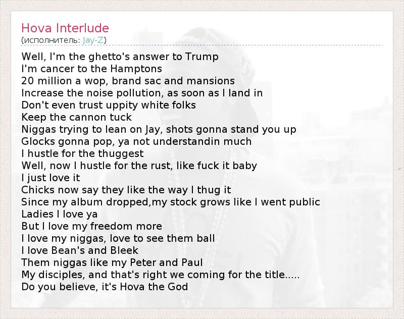 Well, I'm the ghetto's answer to Trump I'm cancer to the Hamptons 20 million a wop, brand sac and mansions Increase the noise pollution, as soon as I land in Don't even trust uppity white folks Keep the cannon tuck Niggas trying to lean on Jay, shots gonna stand you up Glocks gonna pop, ya not understandin much I hustle for the thuggest Well, now I hustle for the rust, like fuck it baby I just love it Chicks now say they like the way I thug it Since my album dropped,my stock grows like I went public Ladies I love ya But I love my freedom more I love my niggas, love to see them ball I love Bean's and Bleek Them niggas like my Peter and Paul My disciples, and that's right we coming for the title..... Do you believe, it's Hova the God