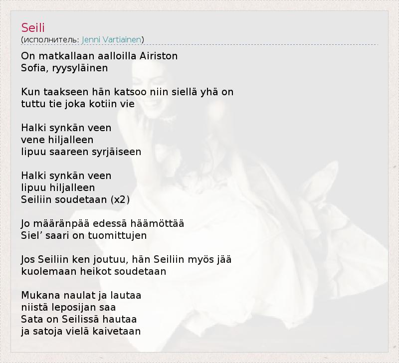 Это интересно:Йенни Мари Вартиайнен (Jenni Mari Vartiainen) родилась 20 марта 1983 года в Куопио, Финляндия. Первая слава пришла к ней в 2002 году, когда она прошла кастинг на популярное музыкальное телешоу, среди участниц которого была сформирована новая девичья группа "Gimmel". Группа успешно выпустила 2 студийных альбома и 5 синглов и даже получила свою "Эмми" в трех категориях, но распалась спустя два года... продолжение