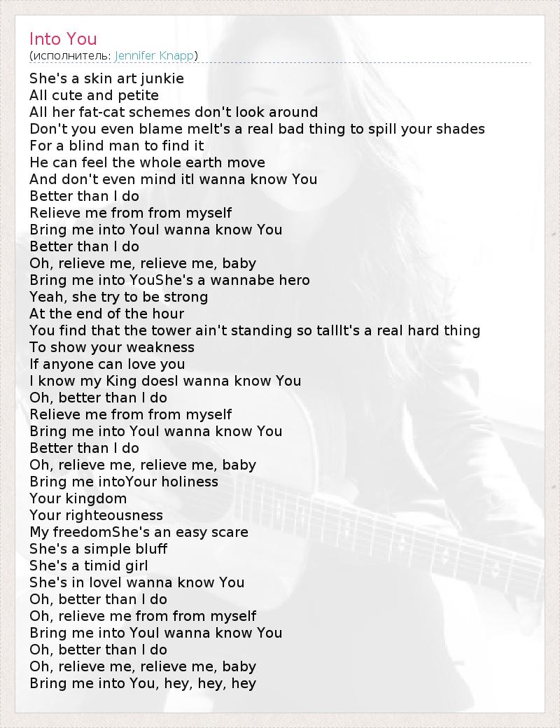 She's a skin art junkie All cute and petite All her fat-cat schemes don't look around Don't you even blame meIt's a real bad thing to spill your shades For a blind man to find it He can feel the whole earth move And don't even mind itI wanna know You Better than I do Relieve me from from myself Bring me into YouI wanna know You Better than I do Oh, relieve me, relieve me, baby Bring me into YouShe's a wannabe hero Yeah, she try to be strong At the end of the hour You find that the tower ain't standing so tallIt's a real hard thing To show your weakness If anyone can love you I know my King doesI wanna know You Oh, better than I do Relieve me from from myself Bring me into YouI wanna know You Better than I do Oh, relieve me, relieve me, baby Bring me intoYour holiness Your kingdom Your righteousness My freedomShe's an easy scare She's a simple bluff She's a timid girl She's in loveI wanna know You Oh, better than I do Oh, relieve me from from myself Bring me into YouI wanna know You Oh, better than I do Oh, relieve me, relieve me, baby Bring me into You, hey, hey, hey