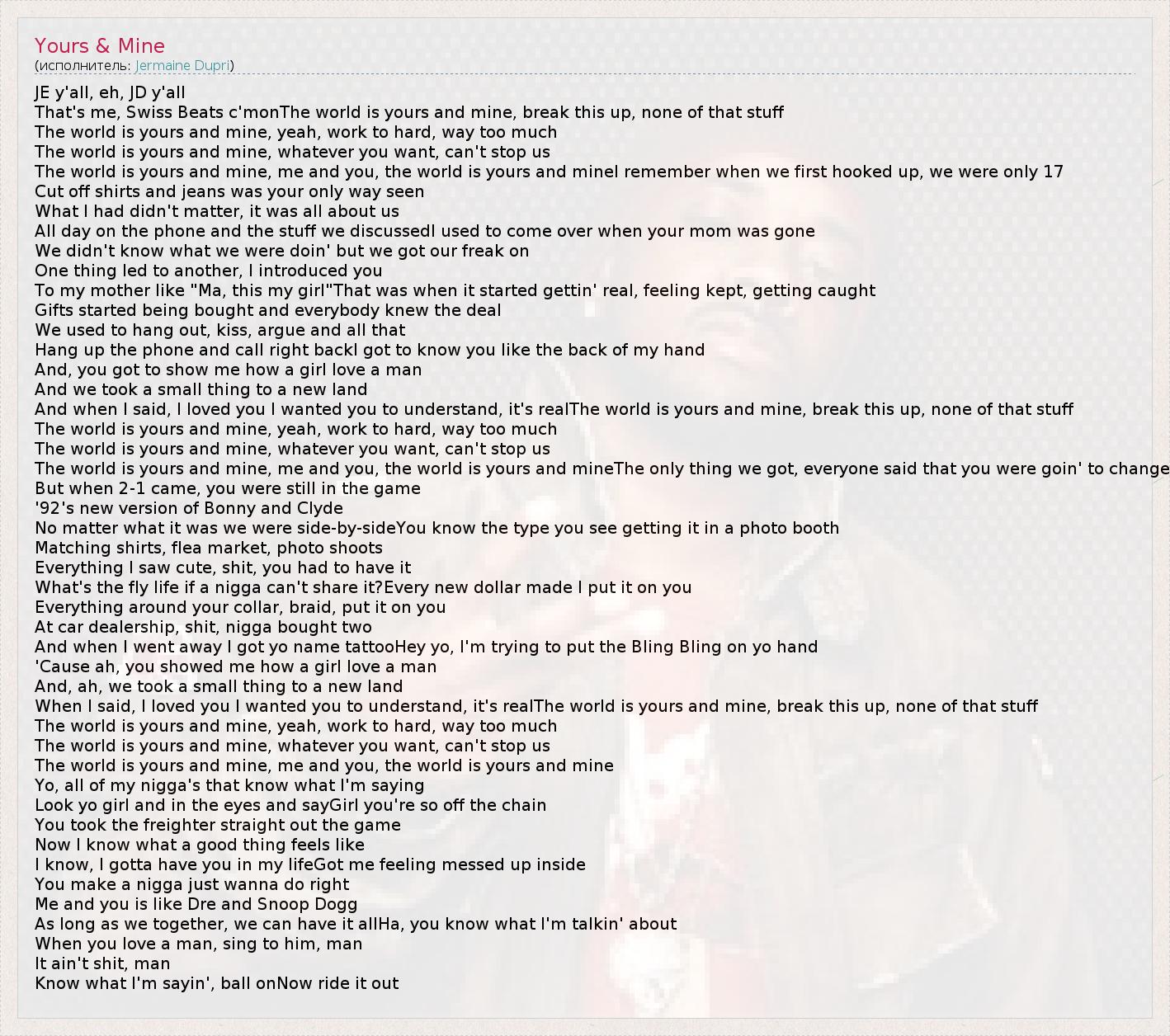 JE y'all, eh, JD y'all That's me, Swiss Beats c'monThe world is yours and mine, break this up, none of that stuff The world is yours and mine, yeah, work to hard, way too much The world is yours and mine, whatever you want, can't stop us The world is yours and mine, me and you, the world is yours and mineI remember when we first hooked up, we were only 17 Cut off shirts and jeans was your only way seen What I had didn't matter, it was all about us All day on the phone and the stuff we discussedI used to come over when your mom was gone We didn't know what we were doin' but we got our freak on One thing led to another, I introduced you To my mother like "Ma, this my girl"That was when it started gettin' real, feeling kept, getting caught Gifts started being bought and everybody knew the deal We used to hang out, kiss, argue and all that Hang up the phone and call right backI got to know you like the back of my hand And, you got to show me how a girl love a man And we took a small thing to a new land And when I said, I loved you I wanted you to understand, it's realThe world is yours and mine, break this up, none of that stuff The world is yours and mine, yeah, work to hard, way too much The world is yours and mine, whatever you want, can't stop us The world is yours and mine, me and you, the world is yours and mineThe only thing we got, everyone said that you were goin' to change But when 2-1 came, you were still in the game '92's new version of Bonny and Clyde No matter what it was we were side-by-sideYou know the type you see getting it in a photo booth Matching shirts, flea market, photo shoots Everything I saw cute, shit, you had to have it What's the fly life if a nigga can't share it?Every new dollar made I put it on you Everything around your collar, braid, put it on you At car dealership, shit, nigga bought two And when I went away I got yo name tattooHey yo, I'm trying to put the Bling Bling on yo hand 'Cause ah, you showed me how a girl love a man And, ah, we took a small thing to a new land When I said, I loved you I wanted you to understand, it's realThe world is yours and mine, break this up, none of that stuff The world is yours and mine, yeah, work to hard, way too much The world is yours and mine, whatever you want, can't stop us The world is yours and mine, me and you, the world is yours and mine Yo, all of my nigga's that know what I'm saying Look yo girl and in the eyes and sayGirl you're so off the chain You took the freighter straight out the game Now I know what a good thing feels like I know, I gotta have you in my lifeGot me feeling messed up inside You make a nigga just wanna do right Me and you is like Dre and Snoop Dogg As long as we together, we can have it allHa, you know what I'm talkin' about When you love a man, sing to him, man It ain't shit, man Know what I'm sayin', ball onNow ride it out