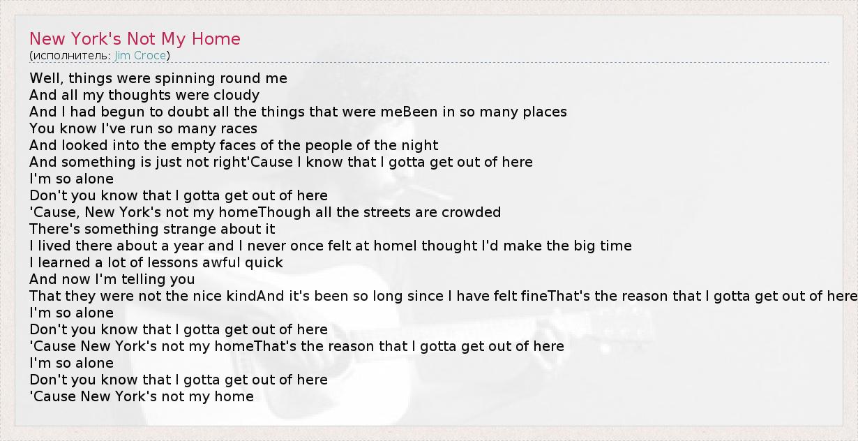 Well, things were spinning round me And all my thoughts were cloudy And I had begun to doubt all the things that were meBeen in so many places You know I've run so many races And looked into the empty faces of the people of the night And something is just not right'Cause I know that I gotta get out of here I'm so alone Don't you know that I gotta get out of here 'Cause, New York's not my homeThough all the streets are crowded There's something strange about it I lived there about a year and I never once felt at homeI thought I'd make the big time I learned a lot of lessons awful quick And now I'm telling you That they were not the nice kindAnd it's been so long since I have felt fineThat's the reason that I gotta get out of here I'm so alone Don't you know that I gotta get out of here 'Cause New York's not my homeThat's the reason that I gotta get out of here I'm so alone Don't you know that I gotta get out of here 'Cause New York's not my home