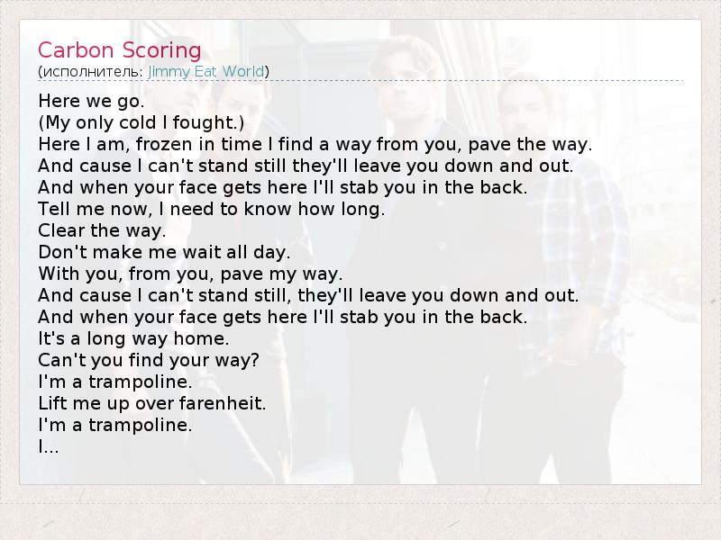 Here we go. (My only cold I fought.) Here I am, frozen in time I find a way from you, pave the way. And cause I can't stand still they'll leave you down and out. And when your face gets here I'll stab you in the back. Tell me now, I need to know how long. Clear the way. Don't make me wait all day. With you, from you, pave my way. And cause I can't stand still, they'll leave you down and out. And when your face gets here I'll stab you in the back. It's a long way home. Can't you find your way? I'm a trampoline. Lift me up over farenheit. I'm a trampoline. I...
