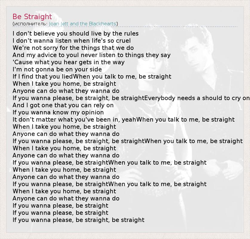 I don't believe you should live by the rules I don't wanna listen when life's so cruel We're not sorry for the things that we do And my advice to youI never listen to things they say 'Cause what you hear gets in the way I'm not gonna be on your side If I find that you liedWhen you talk to me, be straight When I take you home, be straight Anyone can do what they wanna do If you wanna please, be straight, be straightEverybody needs a should to cry on And I got one that you can rely on If you wanna know my opinion It don't matter what you've been in, yeahWhen you talk to me, be straight When I take you home, be straight Anyone can do what they wanna do If you wanna please, be straight, be straightWhen you talk to me, be straight When I take you home, be straight Anyone can do what they wanna do If you wanna please, be straightWhen you talk to me, be straight When I take you home, be straight Anyone can do what they wanna do If you wanna please, be straightWhen you talk to me, be straight When I take you home, be straight Anyone can do what they wanna do If you wanna please, be straight If you wanna please, be straight If you wanna please, be straight, be straight
