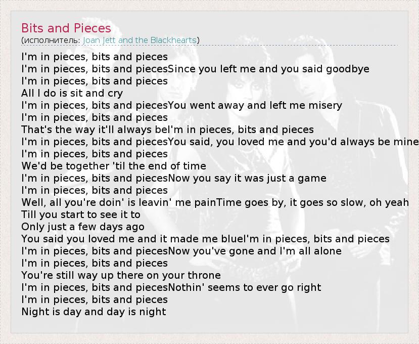 I'm in pieces, bits and pieces I'm in pieces, bits and piecesSince you left me and you said goodbye I'm in pieces, bits and pieces All I do is sit and cry I'm in pieces, bits and piecesYou went away and left me misery I'm in pieces, bits and pieces That's the way it'll always beI'm in pieces, bits and pieces I'm in pieces, bits and piecesYou said, you loved me and you'd always be mine I'm in pieces, bits and pieces We'd be together 'til the end of time I'm in pieces, bits and piecesNow you say it was just a game I'm in pieces, bits and pieces Well, all you're doin' is leavin' me painTime goes by, it goes so slow, oh yeah Till you start to see it to Only just a few days ago You said you loved me and it made me blueI'm in pieces, bits and pieces I'm in pieces, bits and piecesNow you've gone and I'm all alone I'm in pieces, bits and pieces You're still way up there on your throne I'm in pieces, bits and piecesNothin' seems to ever go right I'm in pieces, bits and pieces Night is day and day is night