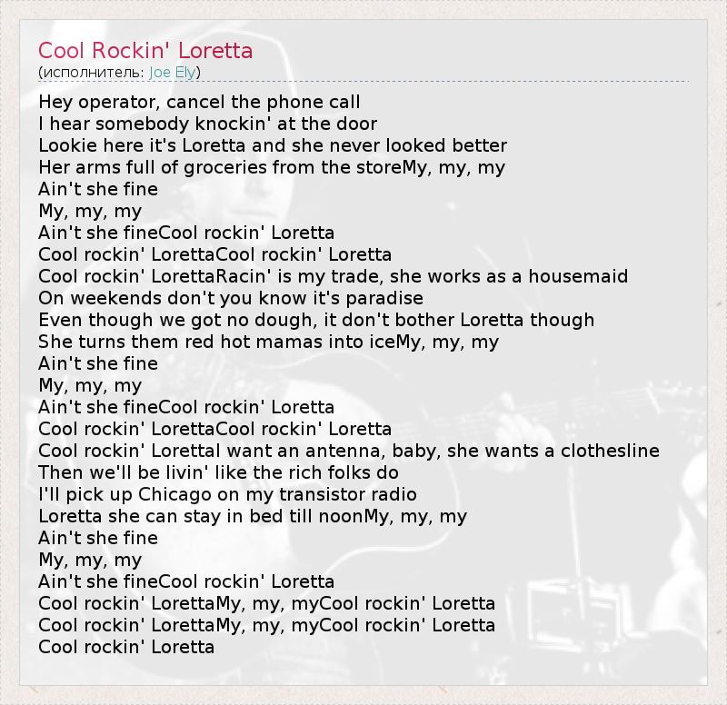 Hey operator, cancel the phone call I hear somebody knockin' at the door Lookie here it's Loretta and she never looked better Her arms full of groceries from the storeMy, my, my Ain't she fine My, my, my Ain't she fineCool rockin' Loretta Cool rockin' LorettaCool rockin' Loretta Cool rockin' LorettaRacin' is my trade, she works as a housemaid On weekends don't you know it's paradise Even though we got no dough, it don't bother Loretta though She turns them red hot mamas into iceMy, my, my Ain't she fine My, my, my Ain't she fineCool rockin' Loretta Cool rockin' LorettaCool rockin' Loretta Cool rockin' LorettaI want an antenna, baby, she wants a clothesline Then we'll be livin' like the rich folks do I'll pick up Chicago on my transistor radio Loretta she can stay in bed till noonMy, my, my Ain't she fine My, my, my Ain't she fineCool rockin' Loretta Cool rockin' LorettaMy, my, myCool rockin' Loretta Cool rockin' LorettaMy, my, myCool rockin' Loretta Cool rockin' Loretta