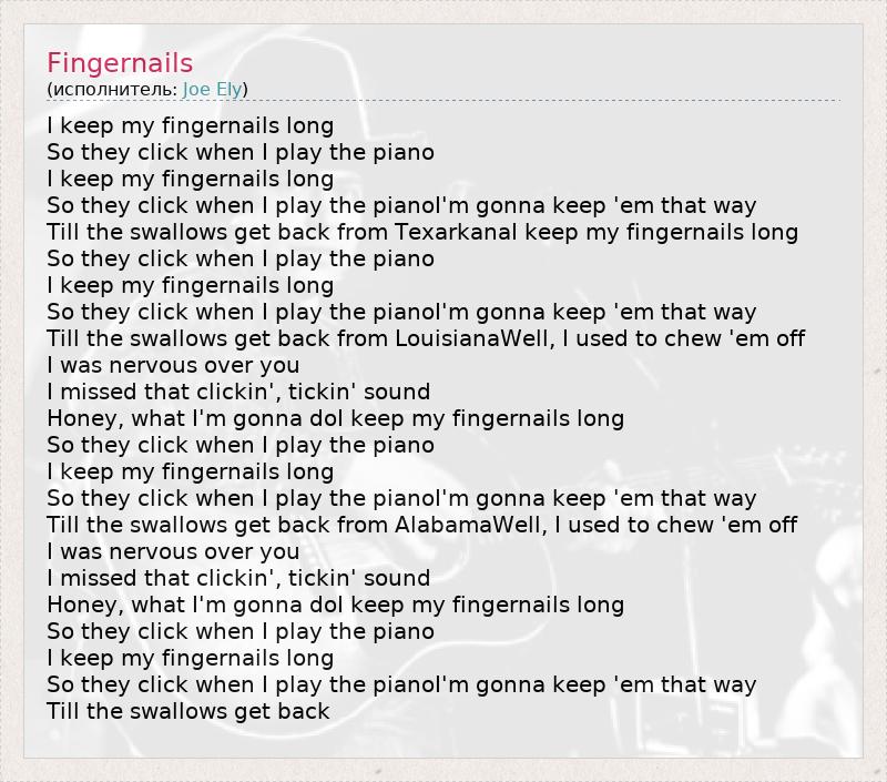 I keep my fingernails long So they click when I play the piano I keep my fingernails long So they click when I play the pianoI'm gonna keep 'em that way Till the swallows get back from TexarkanaI keep my fingernails long So they click when I play the piano I keep my fingernails long So they click when I play the pianoI'm gonna keep 'em that way Till the swallows get back from LouisianaWell, I used to chew 'em off I was nervous over you I missed that clickin', tickin' sound Honey, what I'm gonna doI keep my fingernails long So they click when I play the piano I keep my fingernails long So they click when I play the pianoI'm gonna keep 'em that way Till the swallows get back from AlabamaWell, I used to chew 'em off I was nervous over you I missed that clickin', tickin' sound Honey, what I'm gonna doI keep my fingernails long So they click when I play the piano I keep my fingernails long So they click when I play the pianoI'm gonna keep 'em that way Till the swallows get back