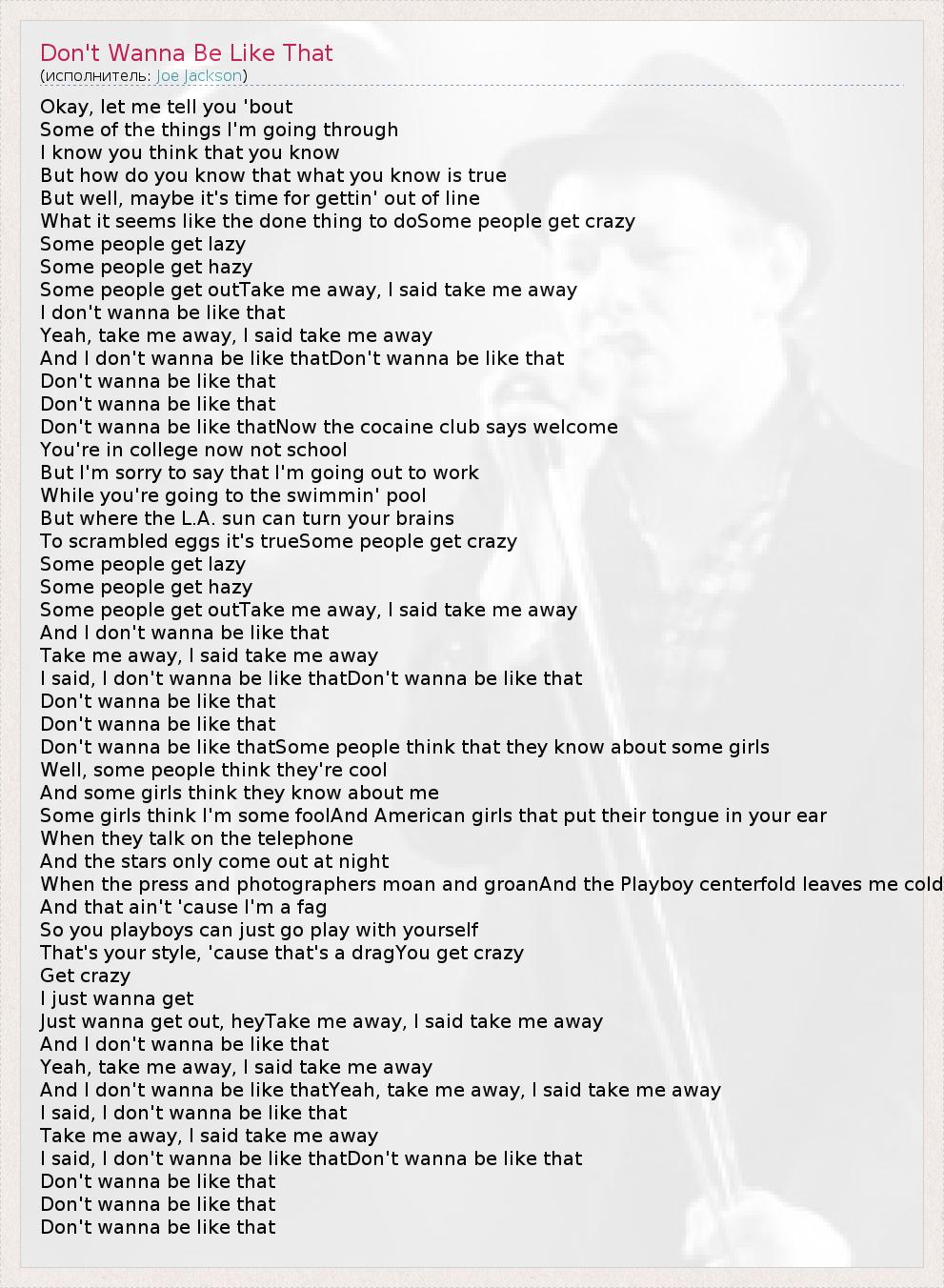 Okay, let me tell you 'bout Some of the things I'm going through I know you think that you know But how do you know that what you know is true But well, maybe it's time for gettin' out of line What it seems like the done thing to doSome people get crazy Some people get lazy Some people get hazy Some people get outTake me away, I said take me away I don't wanna be like that Yeah, take me away, I said take me away And I don't wanna be like thatDon't wanna be like that Don't wanna be like that Don't wanna be like that Don't wanna be like thatNow the cocaine club says welcome You're in college now not school But I'm sorry to say that I'm going out to work While you're going to the swimmin' pool But where the L.A. sun can turn your brains To scrambled eggs it's trueSome people get crazy Some people get lazy Some people get hazy Some people get outTake me away, I said take me away And I don't wanna be like that Take me away, I said take me away I said, I don't wanna be like thatDon't wanna be like that Don't wanna be like that Don't wanna be like that Don't wanna be like thatSome people think that they know about some girls Well, some people think they're cool And some girls think they know about me Some girls think I'm some foolAnd American girls that put their tongue in your ear When they talk on the telephone And the stars only come out at night When the press and photographers moan and groanAnd the Playboy centerfold leaves me cold And that ain't 'cause I'm a fag So you playboys can just go play with yourself That's your style, 'cause that's a dragYou get crazy Get crazy I just wanna get Just wanna get out, heyTake me away, I said take me away And I don't wanna be like that Yeah, take me away, I said take me away And I don't wanna be like thatYeah, take me away, I said take me away I said, I don't wanna be like that Take me away, I said take me away I said, I don't wanna be like thatDon't wanna be like that Don't wanna be like that Don't wanna be like that Don't wanna be like that
