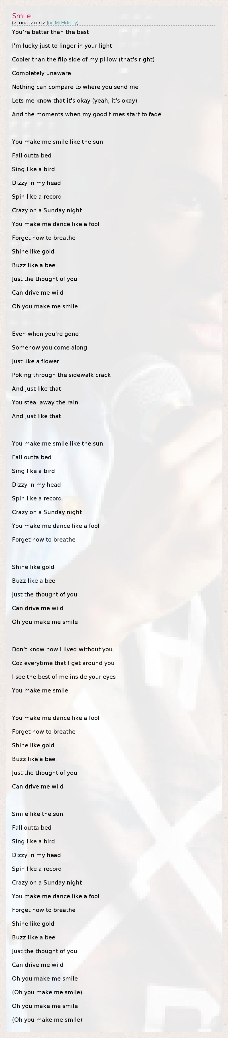 You're better than the best I'm lucky just to linger in your light Cooler than the flip side of my pillow (that's right) Completely unaware Nothing can compare to where you send me Lets me know that it's okay (yeah, it's okay) And the moments when my good times start to fade You make me smile like the sun Fall outta bed Sing like a bird Dizzy in my head Spin like a record Crazy on a Sunday night You make me dance like a fool Forget how to breathe Shine like gold Buzz like a bee Just the thought of you Can drive me wild Oh you make me smile Even when you're gone Somehow you come along Just like a flower Poking through the sidewalk crack And just like that You steal away the rain And just like that You make me smile like the sun Fall outta bed Sing like a bird Dizzy in my head Spin like a record Crazy on a Sunday night You make me dance like a fool Forget how to breathe Shine like gold Buzz like a bee Just the thought of you Can drive me wild Oh you make me smile Don't know how I lived without you Coz everytime that I get around you I see the best of me inside your eyes You make me smile You make me dance like a fool Forget how to breathe Shine like gold Buzz like a bee Just the thought of you Can drive me wild Smile like the sun Fall outta bed Sing like a bird Dizzy in my head Spin like a record Crazy on a Sunday night You make me dance like a fool Forget how to breathe Shine like gold Buzz like a bee Just the thought of you Can drive me wild Oh you make me smile (Oh you make me smile) Oh you make me smile (Oh you make me smile)